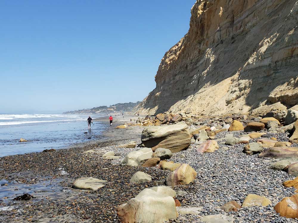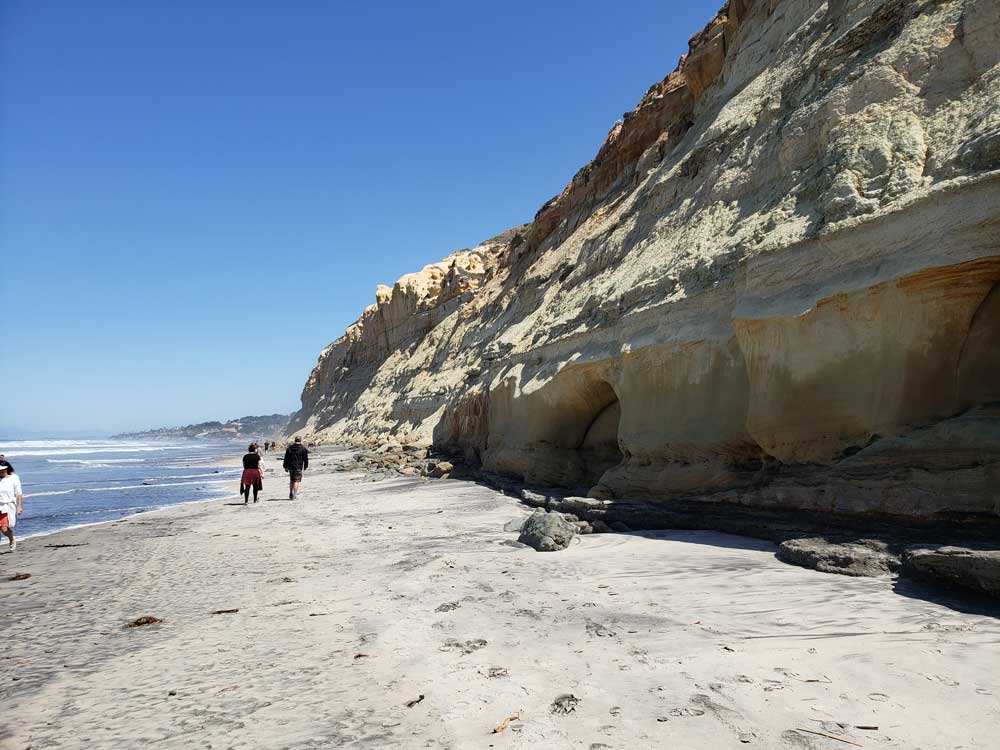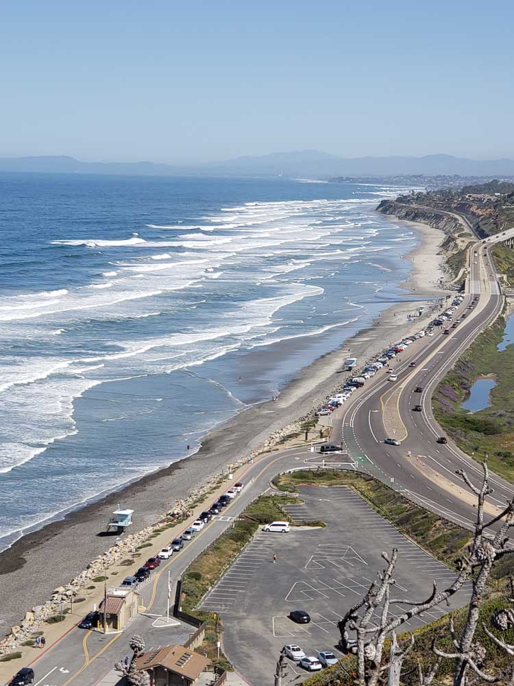 The reserve consists of a plateau with cliffs that overlook Torrey Pines State Beach, and a lagoon that is vital to migrating seabirds. Many different kinds of wildlife and flora are found within the reserve, including bobcat, fox, skunk, raccoon, coyote, rabbit, cacti, coastal chaparral, and the rare Torrey pine. During their migration, it is sometimes possible to see several species of whale from the cliffs, including humpback whale and gray whale. The eight miles of trails within the park offer an attraction for hikers and beach-goers and a small museum sits at the top of the hill. From the cliffs or many places along the beach, it is possible to see La Jolla to the south and Del Mar to the north. At the southern end of the beach is a large rock that projects into the ocean, called Flat Rock. South of the rock is Black's Beach.