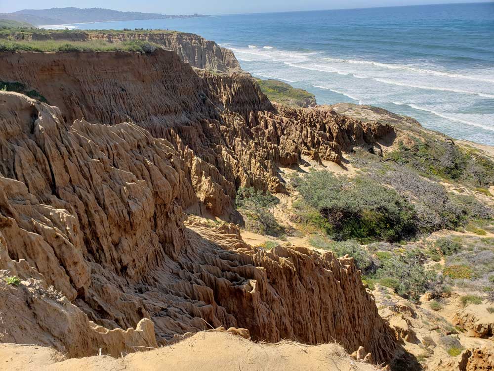 The Torrey Pines State Natural Reserve offers 8 trails to hikers that vary in terms of length, difficulty, and scenery. San Diego Tourism Authority says that three popular trails at the park are Guy Fleming Trail, Razor Point Trail, and Beach Trail. The Guy Fleming Trail is 0.7 miles and is the easiest trail at the park. The trail provides diverse scenery from Peñasquitos Marsh to views of La Jolla and is well known for whale sightings in the winter. The Razor Point Trail is a 1.4-mile loop that provides hikers with a view of ravines and badlands while overlooking the ocean. The Beach Trail is a ¾ mile walk that leads one down to the Torrey Pines State Beach. Although it is the least scenic trail, it is very popular due to taking hikers straight to the wide-open beach. Other trails at the park are the Parry Grove Trail, Yucca Point Trail, High Point Trail, Broken Hill Trail, and Discovery Trail. The official Torrey Pines website provides more information on the other trails.