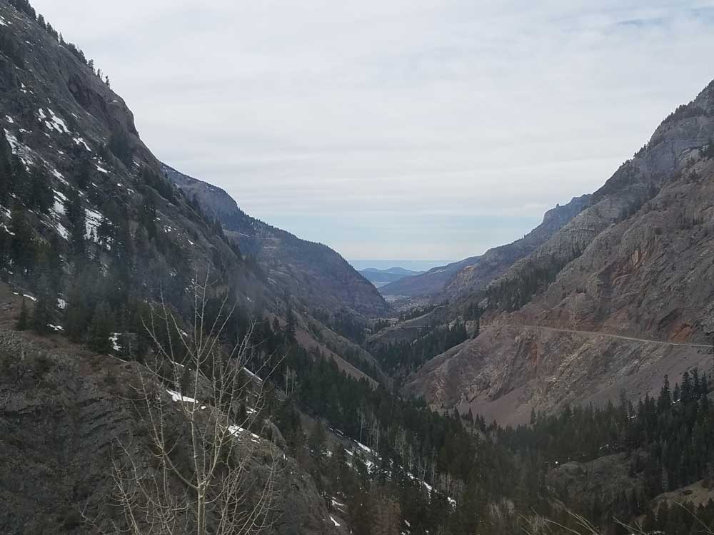From Ridgway, the byway turns south onto US 550 following the Uncompahgre River into the Victorian mining town of Ouray. The highway is referred to as the Million Dollar Highway from Ouray south back to Durango. For the first 7.0 miles (11.3 km) south of Ouray the byway follows through the Uncompahgre Gorge. Just past the only tunnel on the route, just south of Ouray, the road crosses over Bear Creek Falls on a bridge at the location of an impassable toll booth on the original road. The Alpine Loop National Back Country Byway, a four wheel drive jeep road, takes off in the gorge south of Bear Creek Falls. Before leaving the gorge the byway passes through a snow shed under the Riverside Slide avalanche zone. A monument stands near here honoring those who have lost their lives in the avalanche, including several snowplow operators. At this point the byway enters Ironton Park, a nice flat valley in contrast to the gorge. The road ascends several switchbacks, or S-curves, past the Idarado mining operation to the 11,018-foot (3,358 m) summit of Red Mountain Pass, providing views of Red Mountain and several ghost towns. Back into the San Juan National Forest the highway descends through the Chattanooga Valley to Silverton.
