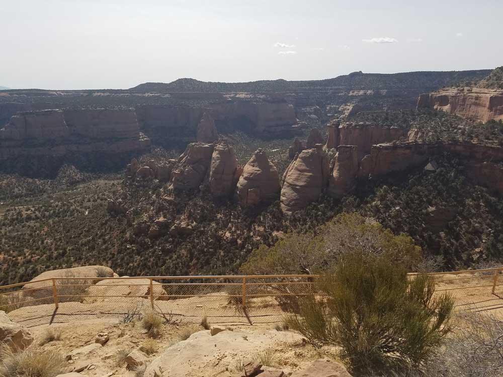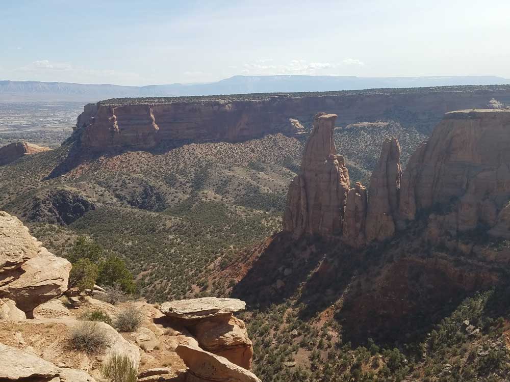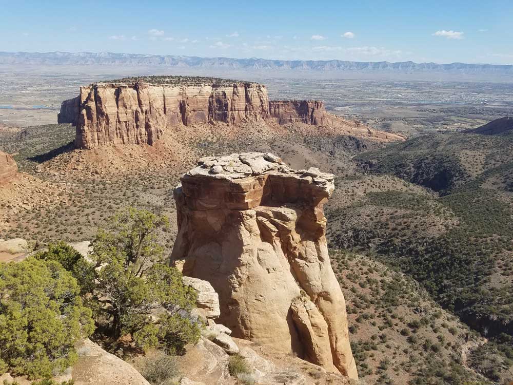Colorado National Monument is a National Park Service unit near the city of Grand Junction, Colorado. Sheer-walled canyons cut deep into sandstone and granite-gneiss-schist rock formations. This is an area of desert land high on the Colorado Plateau, with pinyon and juniper forests on the plateau. The park hosts a wide range of wildlife, including red-tailed hawks, golden eagles, ravens, jays, desert bighorn sheep, and coyotes. Activities include hiking, horseback riding, road bicycling, and scenic drives; a visitor center on the west side contains a natural history museum and gift shop. There are scenic views from trails, Rim Rock Drive, which winds along the plateau, and the campground. Nearby are the Book Cliffs and the largest flat-topped mountain in the world, the Grand Mesa.