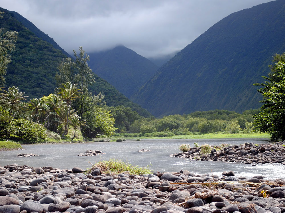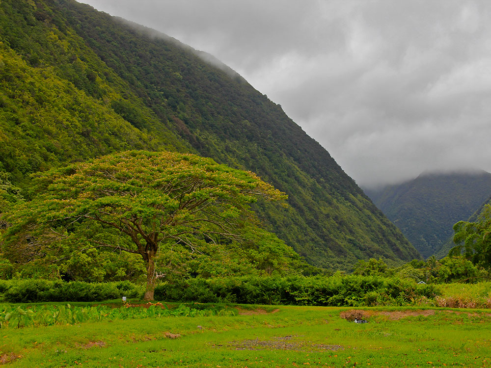 Steep-sided valley with dramatic cliffs, black sand beach, waterfalls, and taro fields, accessible only by guided tour or from a scenic public lookout.