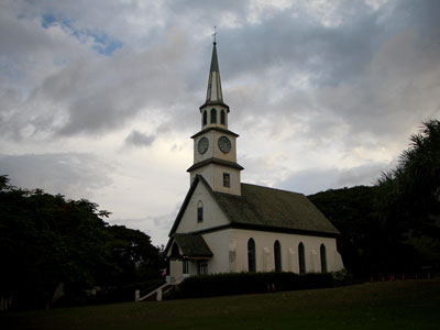 Historic Hawaiian church built in the 19th century featuring New England-style architecture and bilingual worship services.