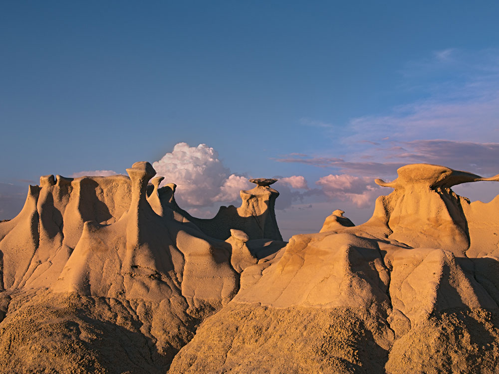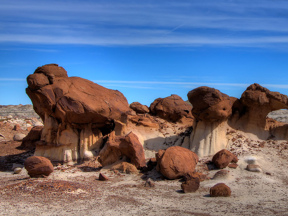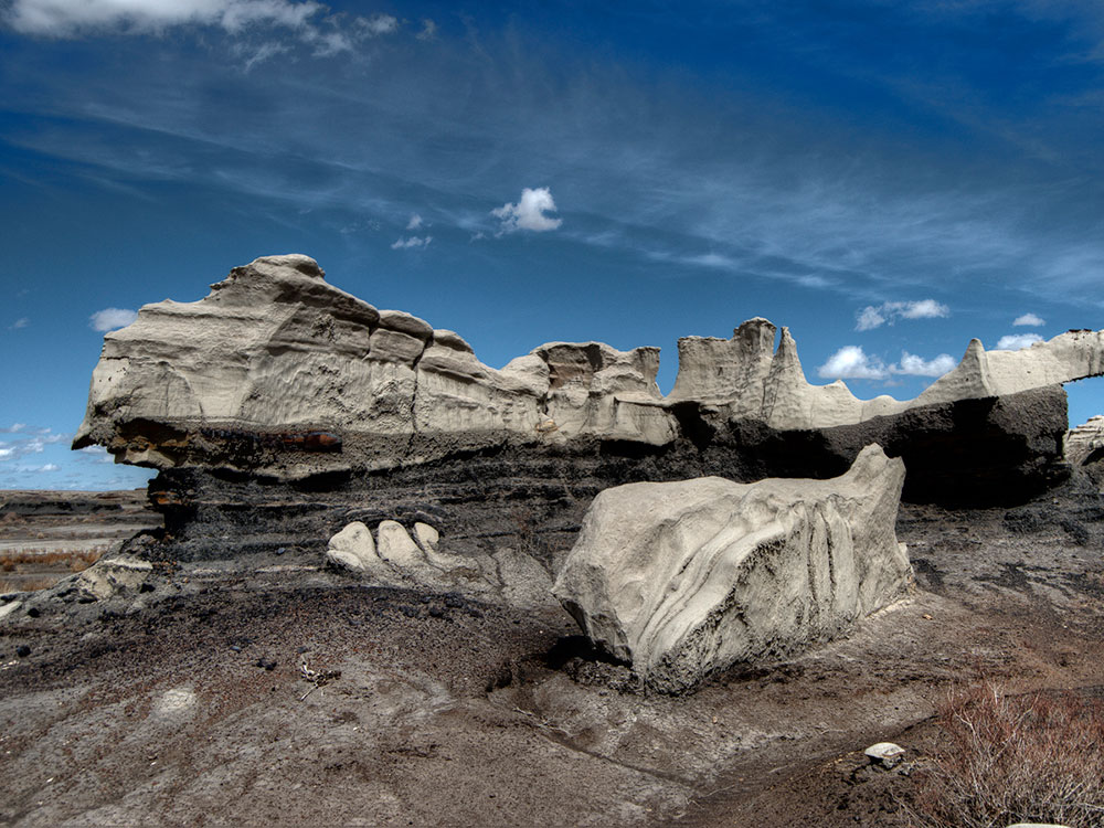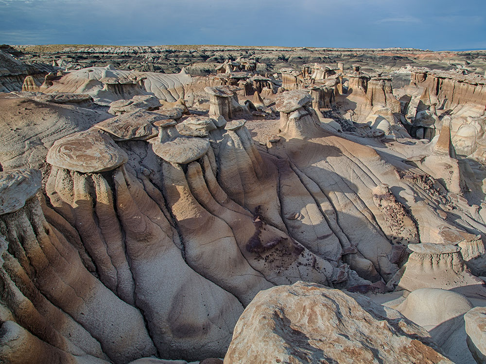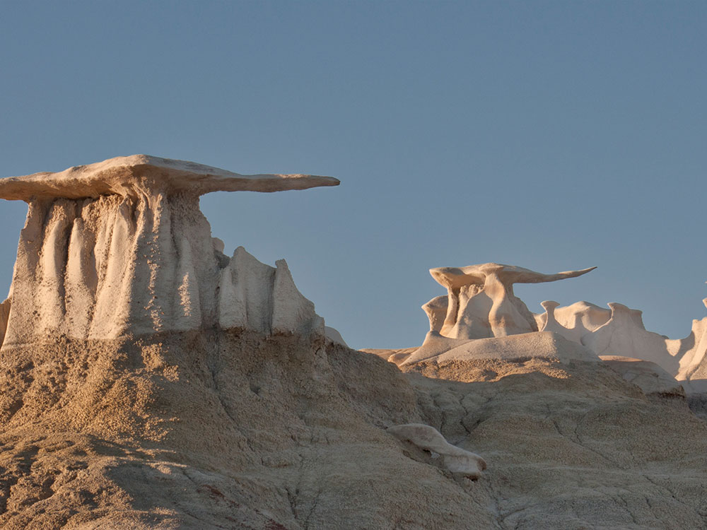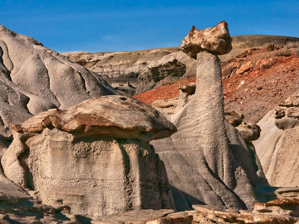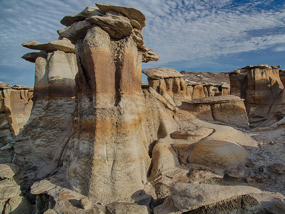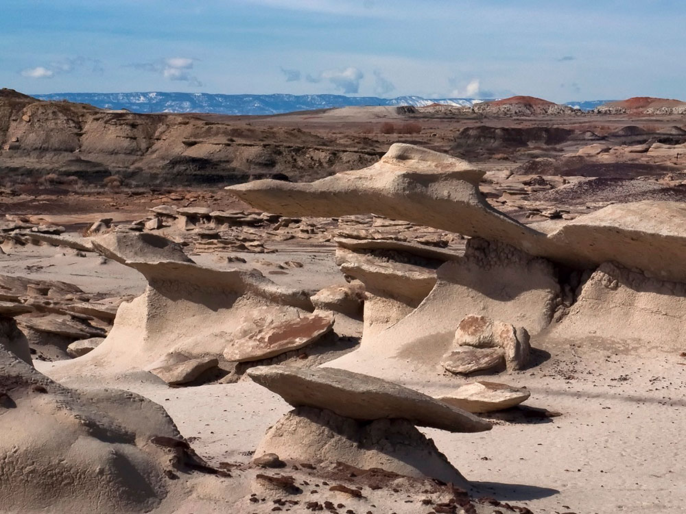 The Bisti/De-Na-Zin Wilderness is a rolling landscape of badlands which offers some of the most unusual scenery found in the Four Corners Region. Time and natural elements have etched a fantasy world of strange rock formations made of interbedded sandstone, shale, mudstone, coal, and silt. The weathering of the sandstone forms hoodoos - weathered rock in the form of pinnacles, spires, cap rocks, and other unusual forms. Fossils occur in this sedimentary landform.