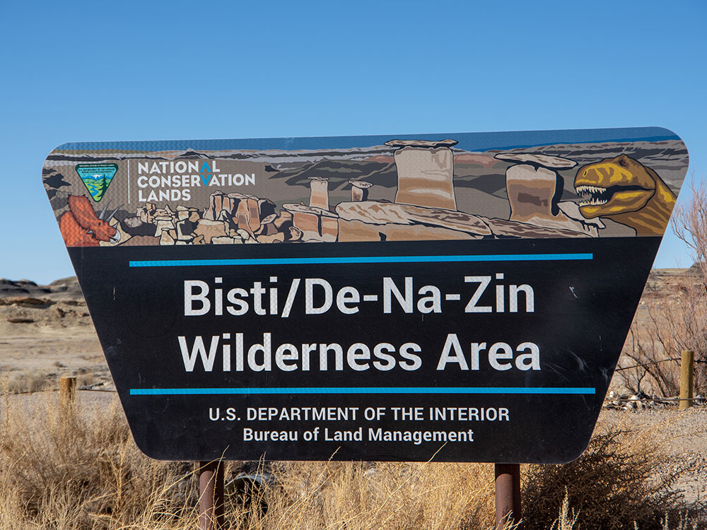 Translated from the Navajo word Bistahí, Bisti means "among the adobe formations." De-Na-Zin, from Navajo Dééł Náázíní, translates as "Standing Crane." Petroglyphs of cranes have been found south of the Wilderness. It is on the Trails of the Ancients Byway, one of the designated New Mexico Scenic Byways.