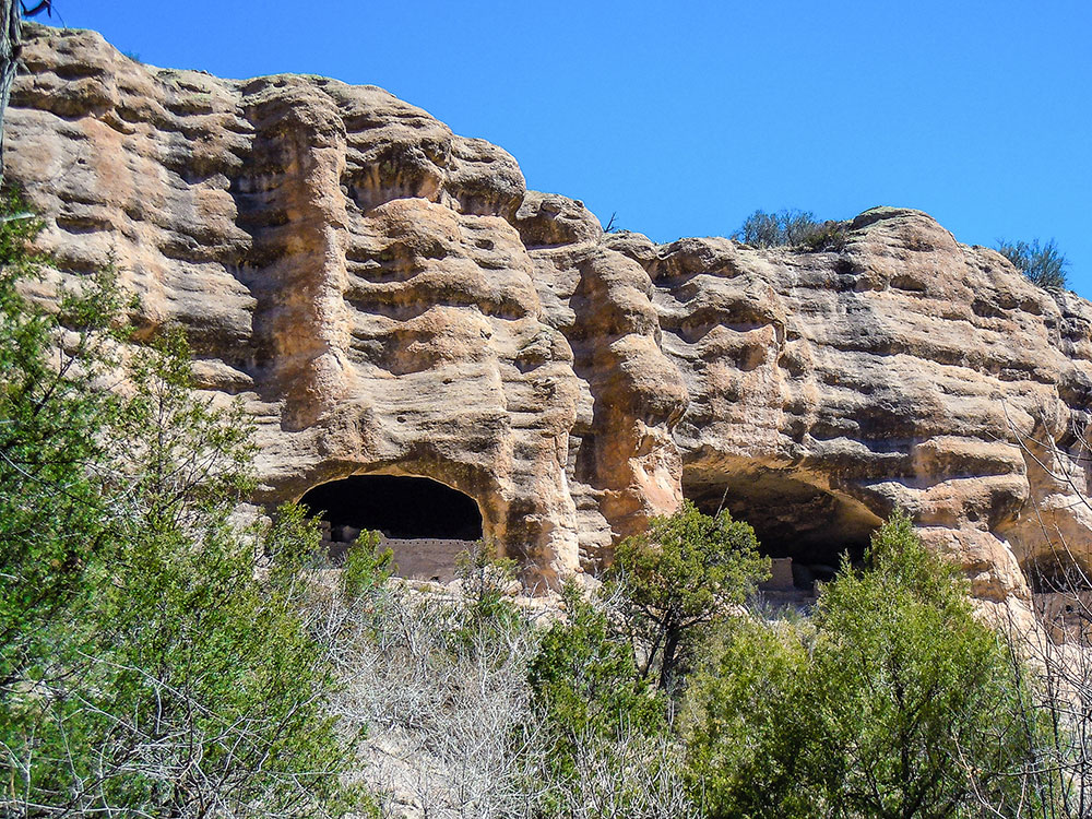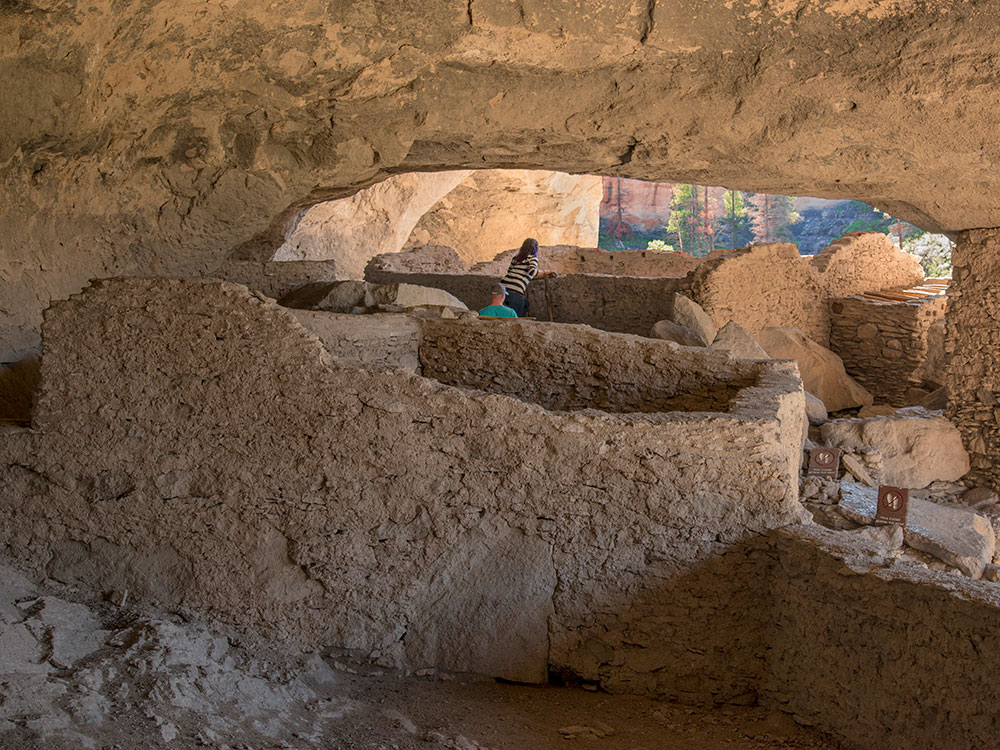 To visit the namesake dwellings, visitors are required to hike a well-traveled 1-mile-long (1.6 km) trail loop with several foot bridges over a stream. The entire walk takes about an hour. The hike begins at an elevation of 5,695 feet (1,736 m) and ends at 5,875 feet (1,791 m).