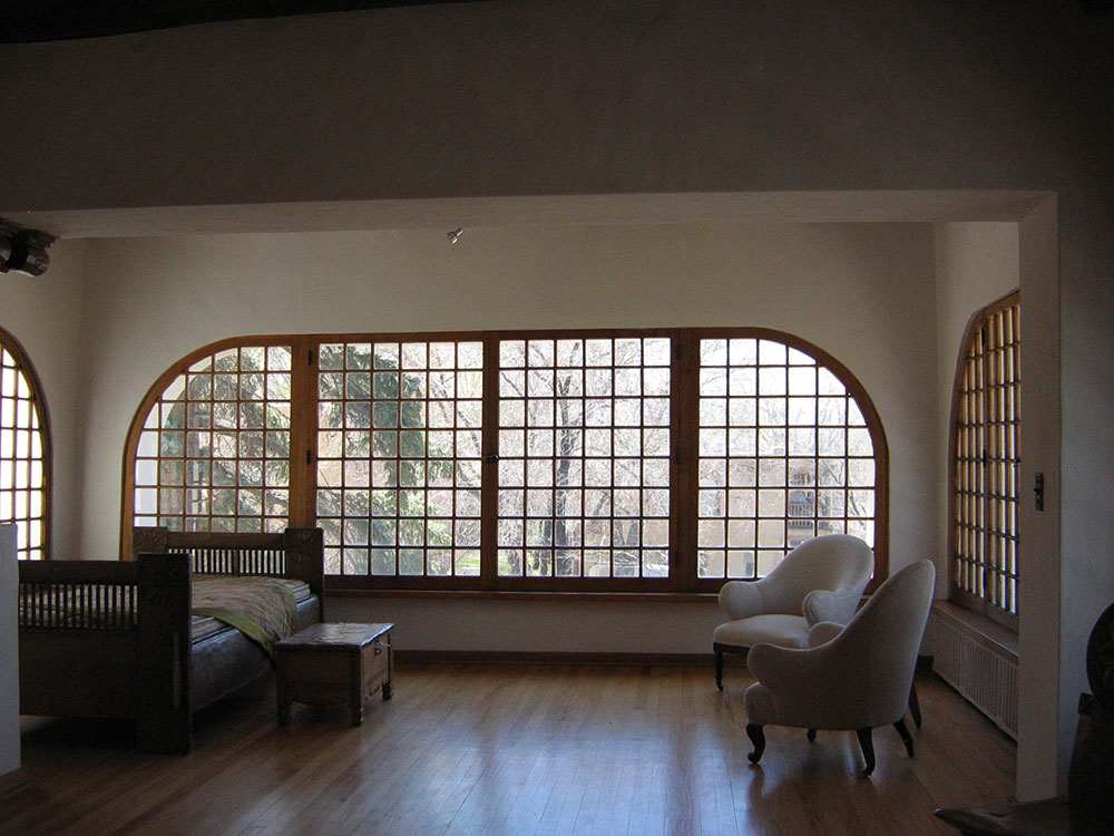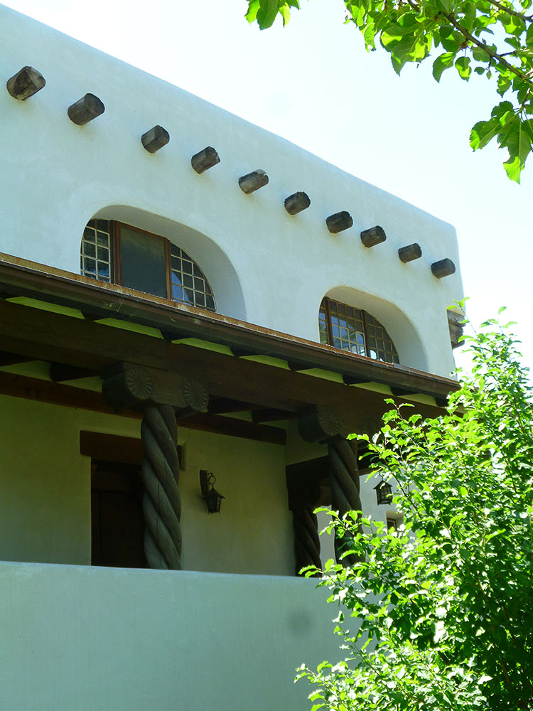 The Nicolai Fechin House in Taos, New Mexico, is the historic home of the Russian artist Nicolai Fechin, his wife Alexandra and daughter Eya. After purchasing the house in 1928, he spent several years enlarging and modifying the two-story adobe structure, for instance, enlarging the porch and adding and widening windows to take advantage of the views. He carved many of the fittings of the house and its furniture, using typical Russian design elements such as "triptych windows and intricately carved doors." The whole reflects a modernist sensibility combined with Russian, Native American and Spanish traditions.