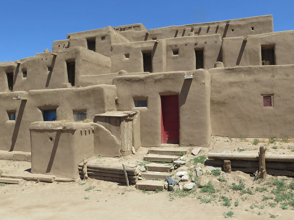 Taos Pueblo's most prominent architectural feature is a multi-storied residential complex of reddish-brown adobe, built on either side of the Rio Pueblo.
