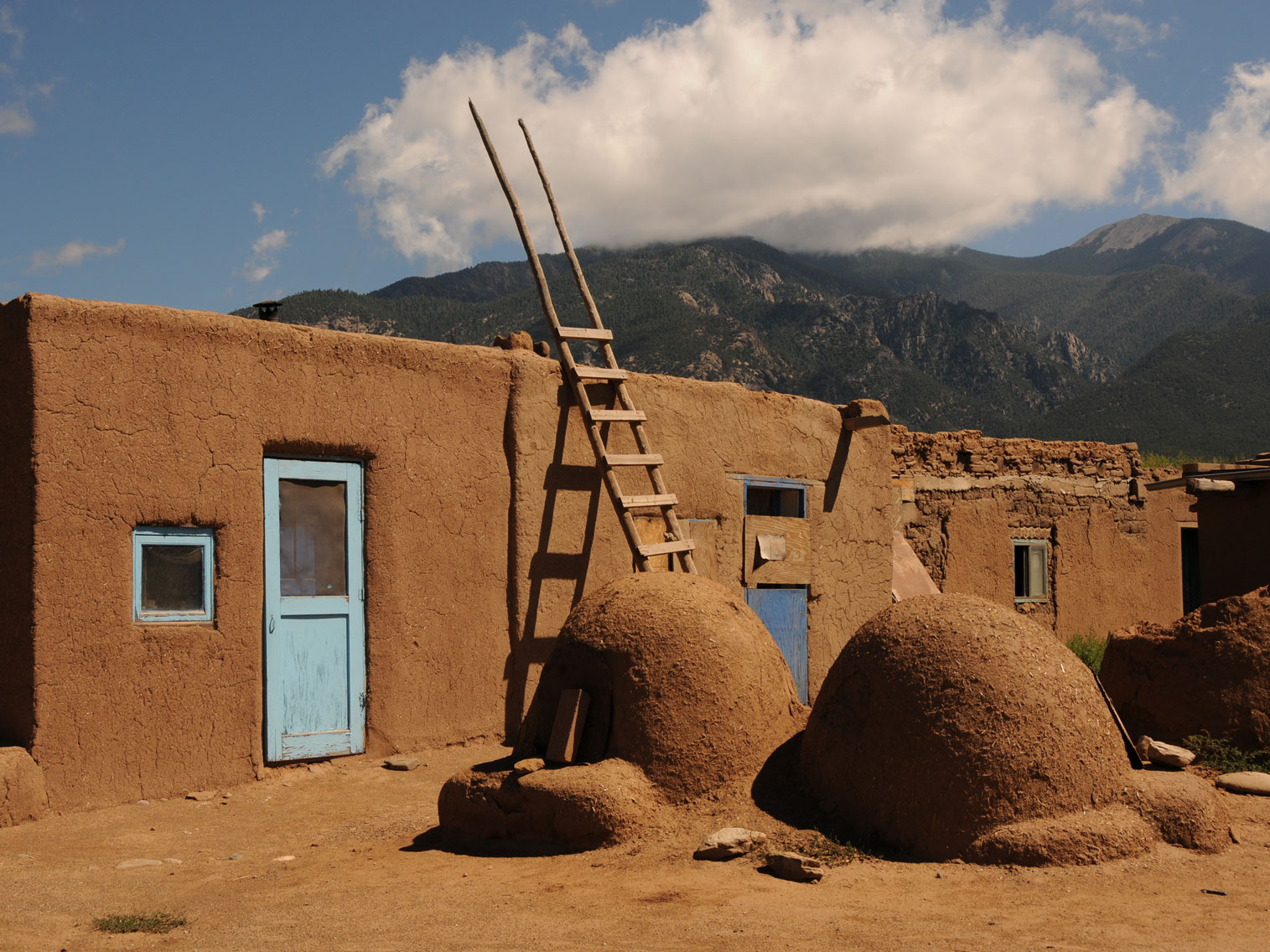 The north-side Pueblo is said to be one of the most photographed and painted buildings in North America. It is the largest multistoried Pueblo structure still existing. It is made of adobe walls that are often several feet thick. Its primary purpose was for defense. Up to as late as 1900, access to the rooms on lower floors was by ladders on the outside to the roof, and then down an inside ladder. In case of an attack, outside ladders could easily be pulled up.
