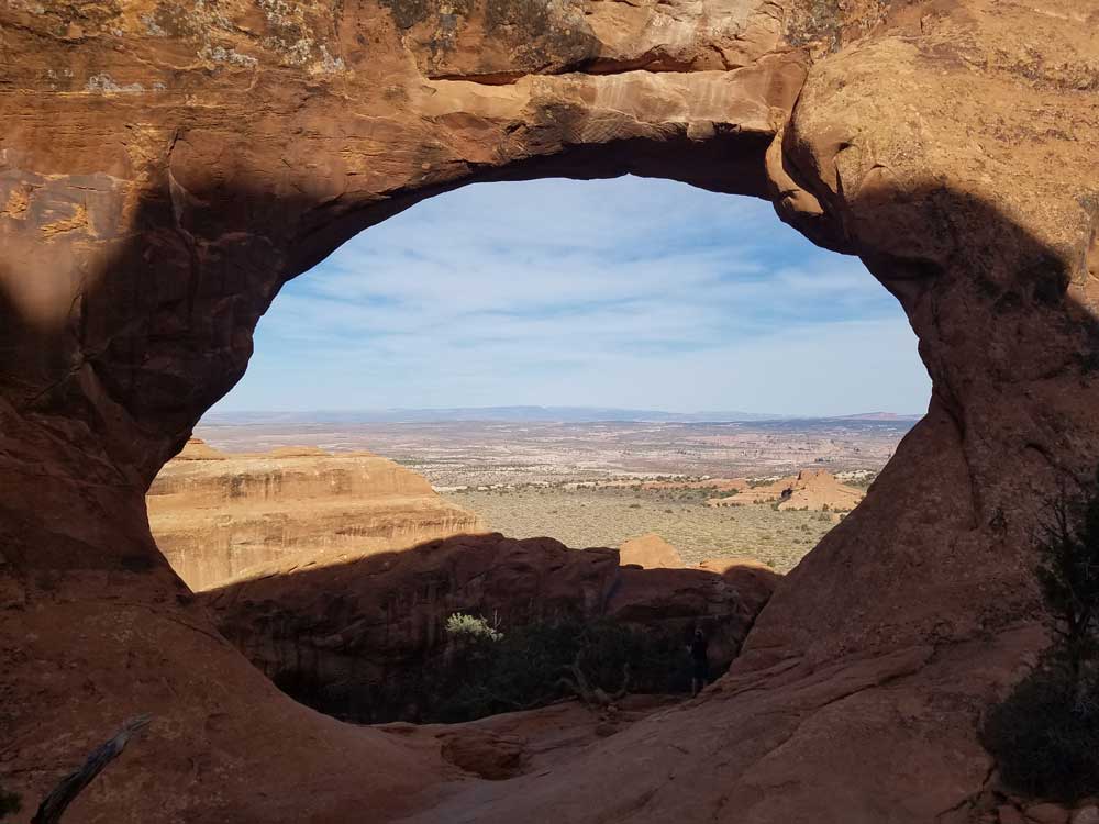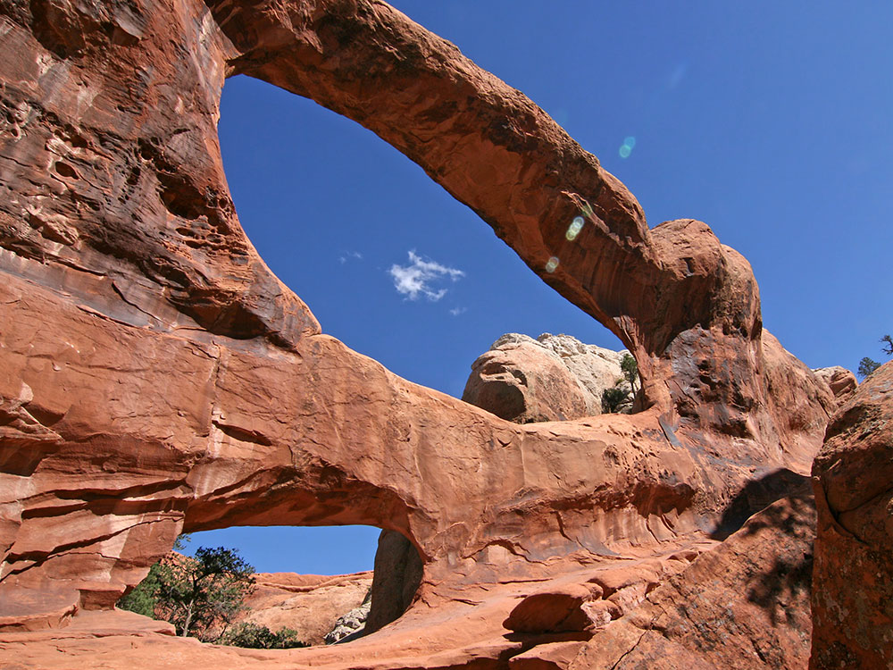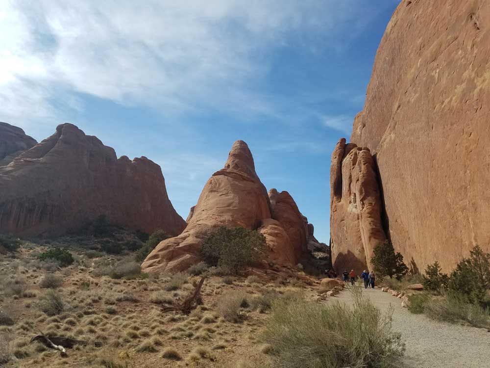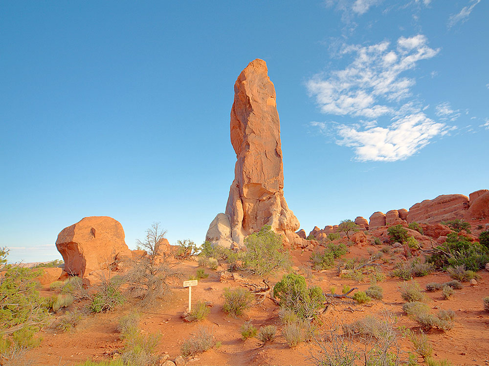 Trail leading directly to Landscape Arch, Tunnel Arch, Pine Tree Arch, Partition, Navajo, Double O, and Private Arch, as well as the Dark Angel monolith and Fin Canyon, which are accessed via the primitive loop trail and its spurs