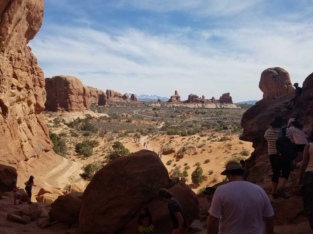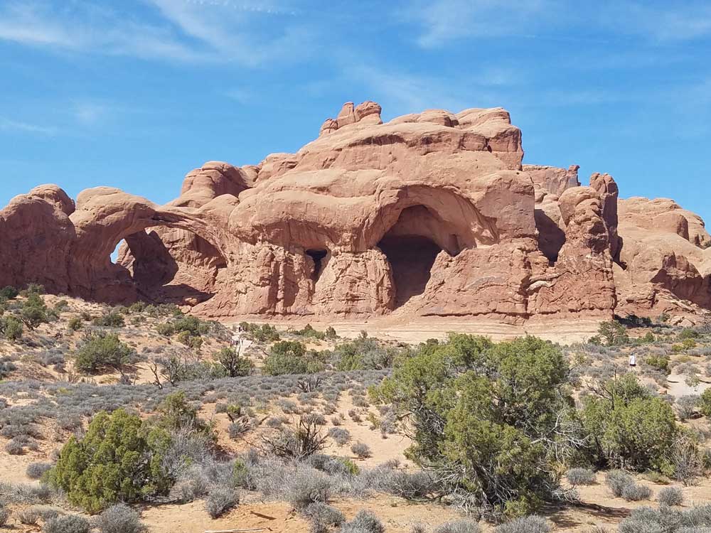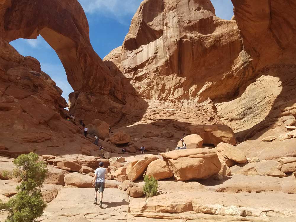 The Double Arch parking area is a 0.5-mile (0.80 km) round trip to the arches that may be wheelchair accessible, with assistance. No guardrails or fences prevent visitors from exploring directly beneath and through the arches.