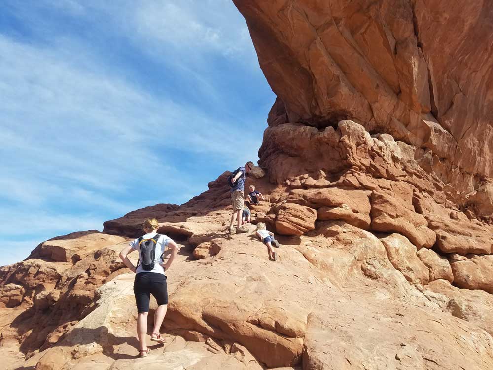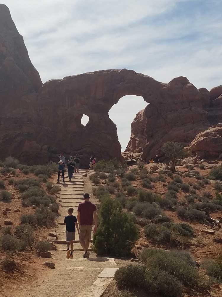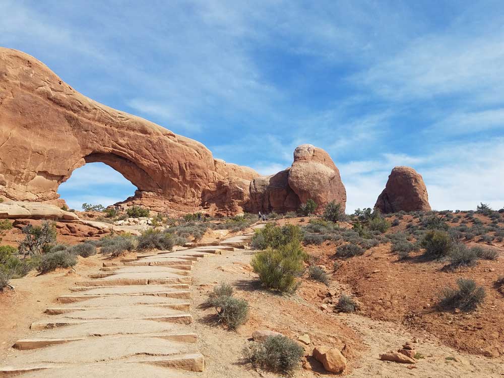 A gentle climb up a gravel trail and stone steps leads to the massive North Window, South Window, and Turret Arch. Return to the parking lot via the same trail, or take the slightly longer primitive trail around the Windows by starting at South Window viewpoint. First 100 yards may be accessible to wheelchairs with assistance.