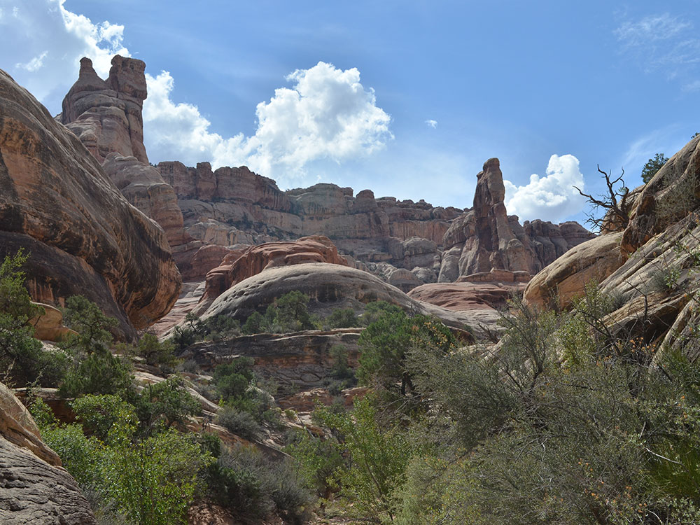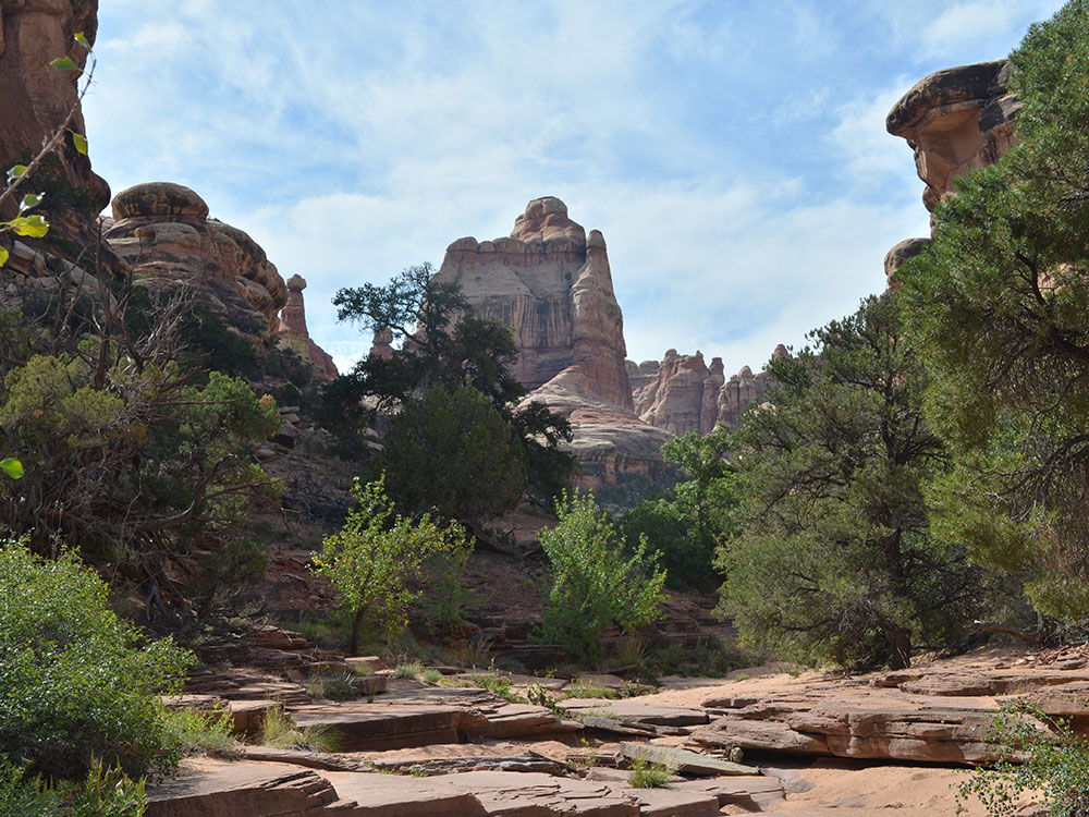 This trail offers one of the most spectacular views in The Needles. It follows the first part of the Chesler Park trail, then branches off to travel along the bottom of Elephant Canyon through deep sand and loose rock. The last 0.25 mile at the upper end is steep with one ladder and some scrambling.