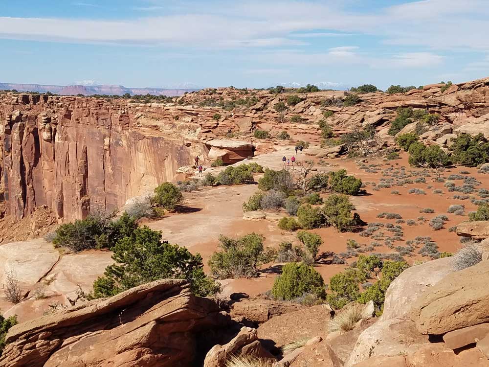 From the parking lot, you can walk a paved 100-yard trail (91 m) to the first viewpoint. This trail is accessible to wheelchairs. Rangers often offer geology talks at the viewpoint, and there are outdoor exhibits describing the view. From the viewpoint, an outdoor exhibit points out features like The Needles, Monument Basin, the La Sal Mountains, the Abajo Mountains, and the White Rim Road. Beyond the paved sidewalk, an unpaved trail continues another mile (1.6 km) down stairs and along uneven surfaces and cliff edges to a second viewpoint. Allow about 90 minutes roundtrip to hike the longer trail.